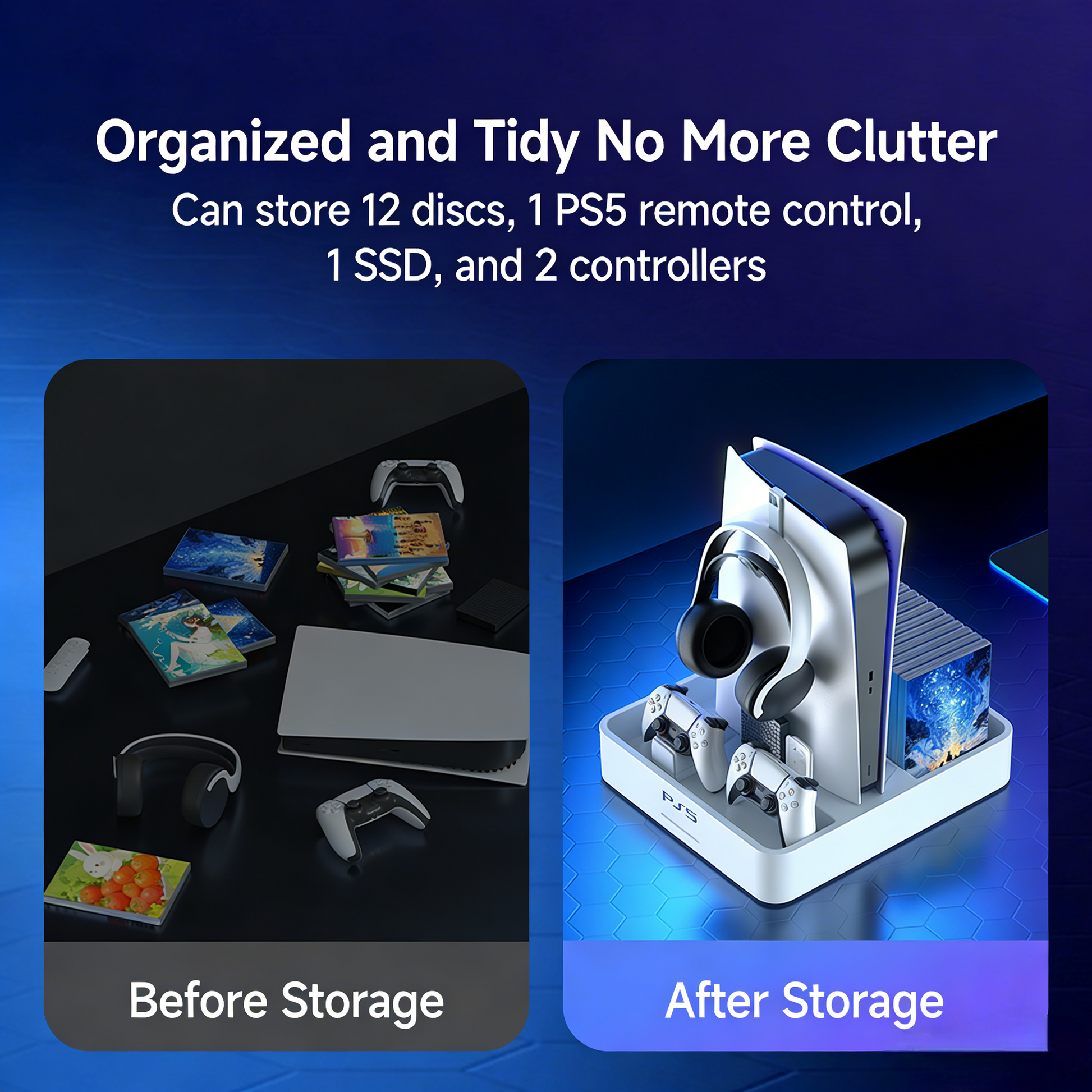 Store 12 game discs, 1 PS5 remote, 1 solid-state drive, and 2 controllers. Equipped with 3 USB expansion ports, a cable storage slot, and a headphone hook—for a clutter-free gaming setup! - 🔌 Universal Compatibility with All PS5 Models