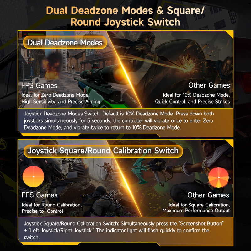 Dual Deadzone Modes & Joystick Calibration: Tailor your gameplay with adjustable dead zones and a switchable joystick shape (square/round), providing the best control across FPS, racing, and adventure games.