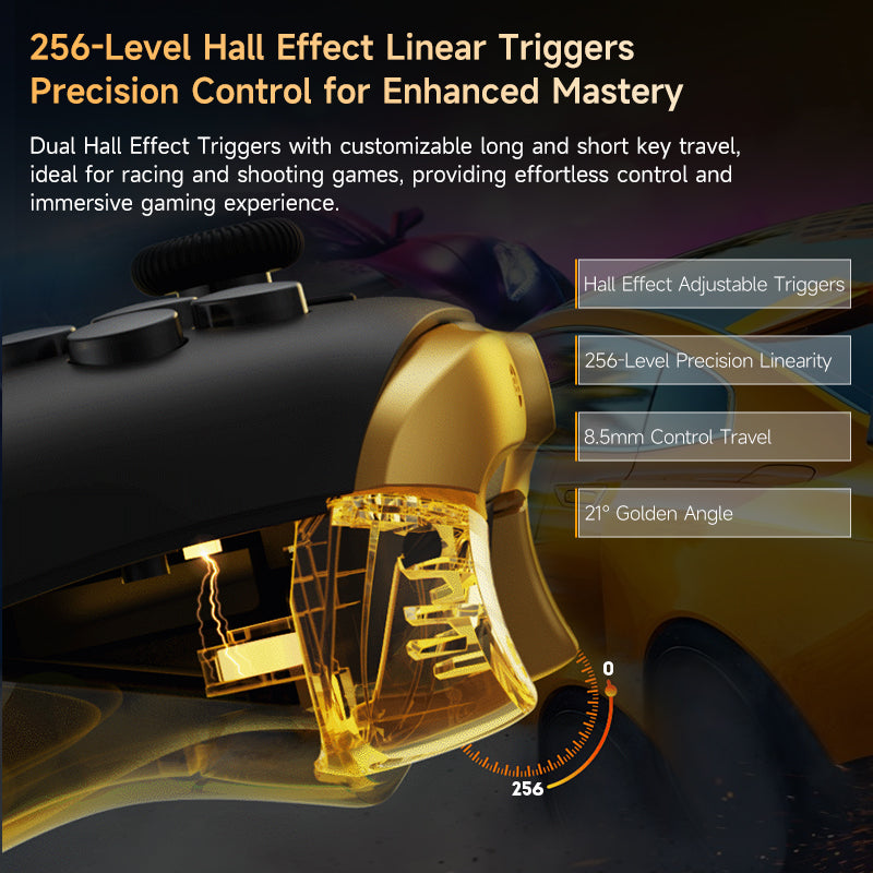 256-Level Hall Effect Linear Triggers: Experience unmatched precision with adjustable triggers featuring 256 levels of sensitivity, ideal for driving and shooting games.
