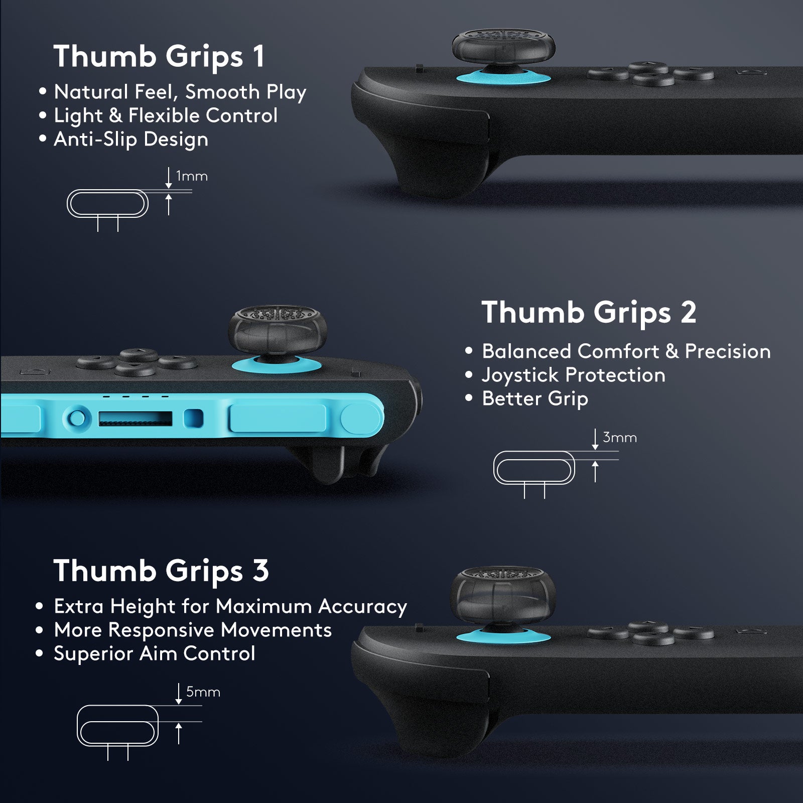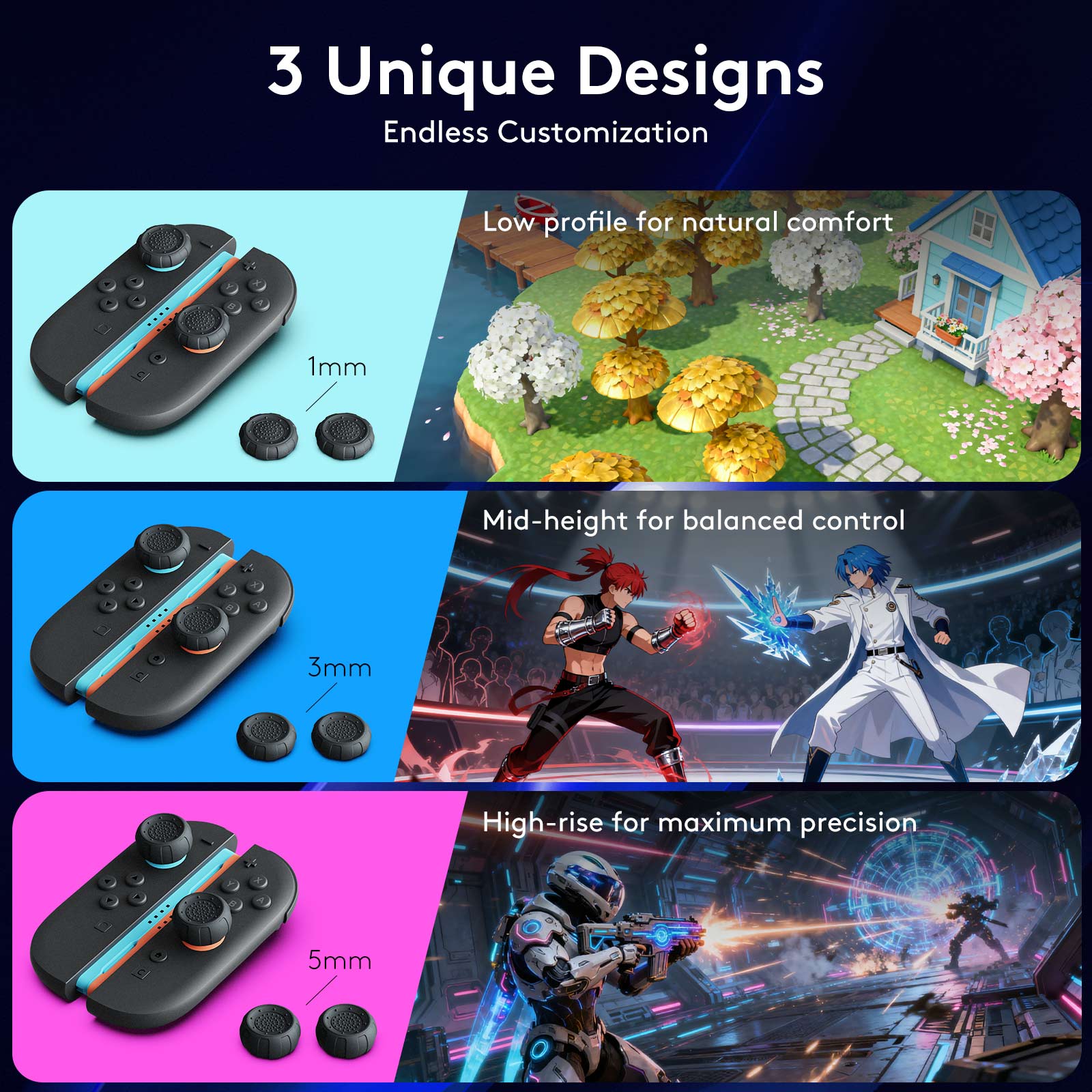 - 3 Multimodal Thumb Grips for All Gaming Needs — Ultra-thin for casual gameplay, medium for fighting games, and thickened for shooting games.
